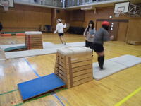 5年生が、台上前転に挑戦中です。次の技につなげるためには、ゆっくり回って膝を伸ばして前転します。