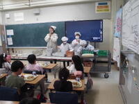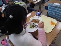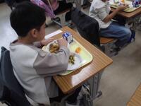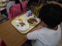 1年生の給食の時間にお邪魔しました。配膳も4月に比べると半分くらいの時間でできるようになったように感じます。