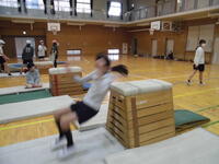 5年生が、台上前転に挑戦中です。次の技につなげるためには、ゆっくり回って膝を伸ばして前転します。