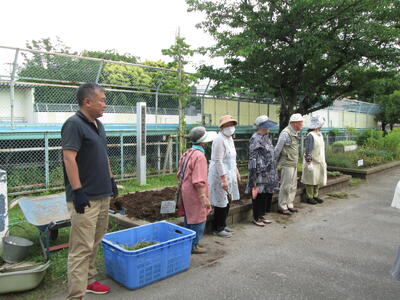 栽培委員会は、地域の方と一緒に花壇の土づくりや雑草抜きをしました。