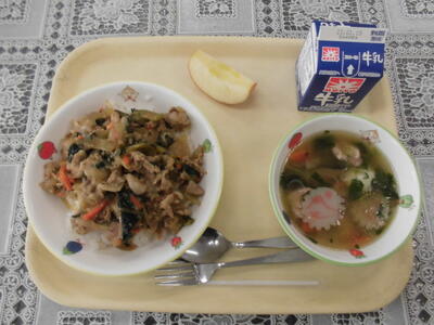 3学期最初の給食は豚肉と小松菜丼でした。野菜もたくさん入っていて栄養満点です。