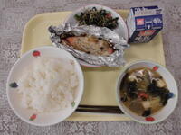 鮭のマヨネーズ焼き  のり酢和え  さつまいもとわかめの味噌汁  ごはん  牛乳