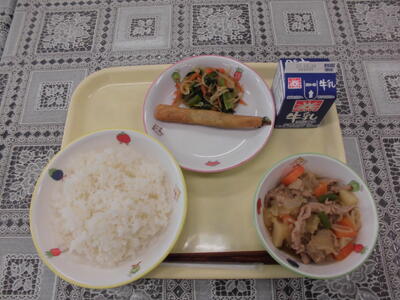 ししゃものパリパリ揚げ 肉じゃが もやしと小松菜のピリ辛和え ごはん 牛乳