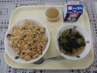 親子丼(麦ごはん) わかめのスープ りんごゼリー 牛乳