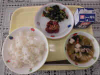 ヤンニョムチキン 冬瓜の中華スープ 中華風の酢の物 ごはん 牛乳