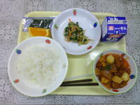 鶏と野菜の甘酢あん ささみと小松菜の中華和え ごはん 牛乳 清美オレンジ
