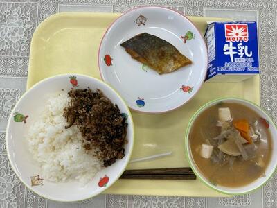ごはん・牛乳・あじのカレー焼き・みそけんちん汁・おかかふりかけ