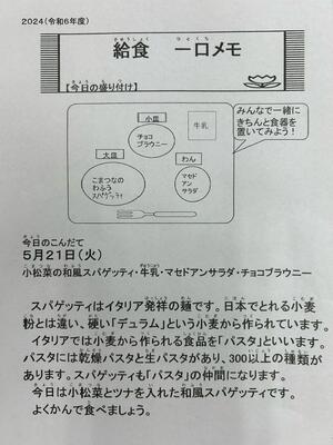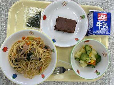 小松菜の和風スパゲティ・牛乳・マセドアンサラダ・チョコブラウニー