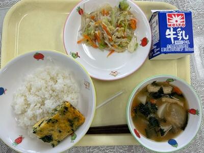 ごはん・牛乳・千草卵焼き・市川汁・塩だれキャベツ