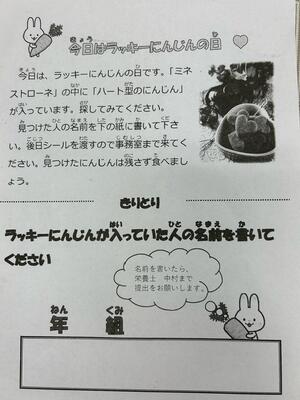 ミネストローネスープの中にハート型のにんじんが各クラスに1枚入っています。