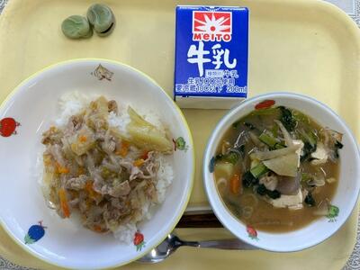 ごはん・牛乳・ねぎ塩豚丼の具・さつま汁・そら豆
