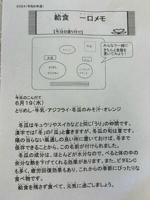 6月19日(水) 投稿日時 : 2024/06/19 宮久保小学校管理者 とりめし・牛乳・アジフライ・冬瓜のみそ汁・オレンジ 今日はアジフライです。 衣がサクッとして、魚の臭みもなく、おいしくいただけます。 冬瓜のみそ汁は、体の熱を下げ、疲労回復効果もあるそうで、今日の暑さにぴったりです。