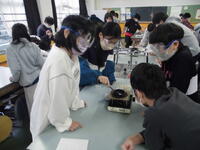 食塩を一生懸命溶かしていました。ろ紙を使って、ろ過していました。今日は寒かったので、飛散防止メガネが曇っていて