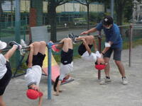 2年生が 鉄棒あそびに取り組んでいました。足掛け振りができるようになった子もいました。