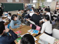 自分の読んだ本を、グループの友達に紹介します。一人で何冊も用意して紹介していました。