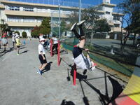 4年生  雨もあがり 太陽が出てポカポカ陽気の中、鉄棒運動に取り組んでいました。