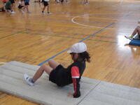 4年生がマット運動で、壁倒立に挑戦中方にしっかり体重が乗らないとつぶれてしまいます。さあ上手にできるかな?
