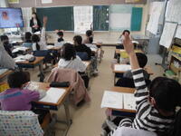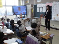 例に学習しています。大型提示装置と子供たちのタブレットには同じ画像を写しています。