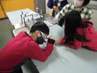 食塩を一生懸命溶かしていました。ろ紙を使って、ろ過していました。今日は寒かったので、飛散防止メガネが曇っていて