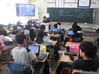 5年生の引率で担任不在の教室では、教務主任が入りタブレットを使って自習をしていました。