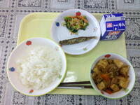 鶏じゃが アジフライ ゴマ酢和え ごはん 牛乳