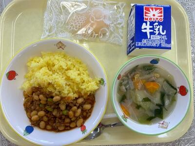 ターメリックライス・牛乳・チリコンカン・野菜スープ・冷凍洋ナシ