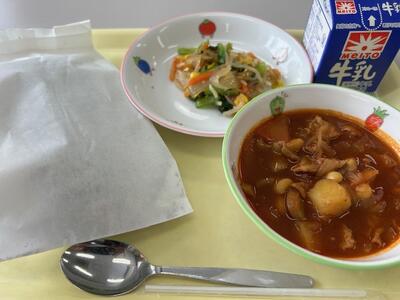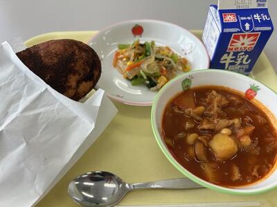 ココア揚げパン・牛乳・ポークビーンズ・こんにゃくサラダ