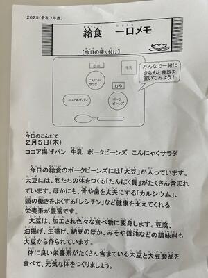 ごはん・牛乳・いわしのピリ辛ソース・節分すまし汁・ハムサラダ・福豆