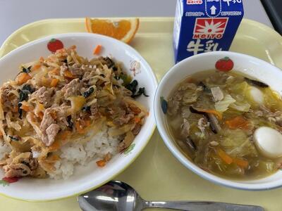ごはん・牛乳・キムタク丼の具・タイピーエン・いよかん