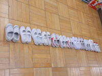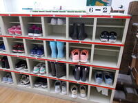 昇降口では、下駄箱の使い方の確認です。みんなしっかり先生の話を聞いていました。