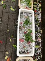 3日(金)…天気の急変、あっという間に雹で埋め尽くされました(職員室前)。