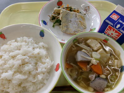 主食、主菜、副菜、汁物(具沢山なので副菜でもあります)が揃った和食給食