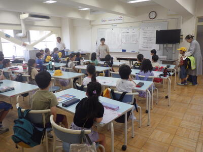 朝から体育着に着替えて先生のお話を聞いている1年生!