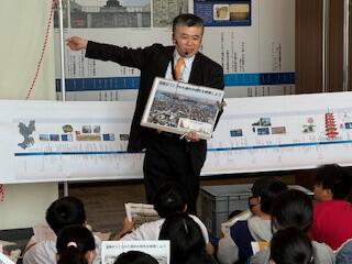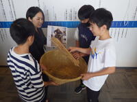 歴史を裏付ける品々を手に取り、話を聞く宮田っ子!