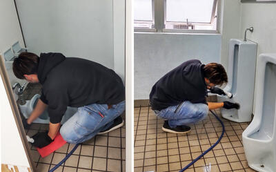 床洗浄機と専用の洗浄液を使い、床を中心に徹底的に清掃。日頃の子ども達のトイレ掃除では手の届かない箇所も隅々まで清掃されていました。