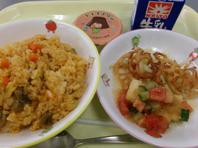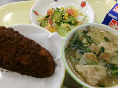 ココア揚げパン(紙ナフキン) ワンタンスープ ミモザサラダ 牛乳