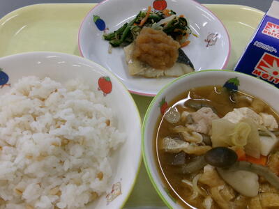 もち麦ご飯 牛乳 ほっけの干物と大根おろし 辛し和え 豚汁