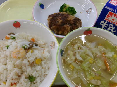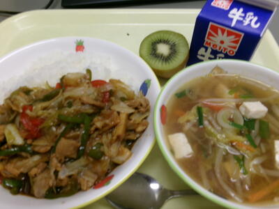 ご飯 ホイコーロー 中華スープ キウイ 牛乳