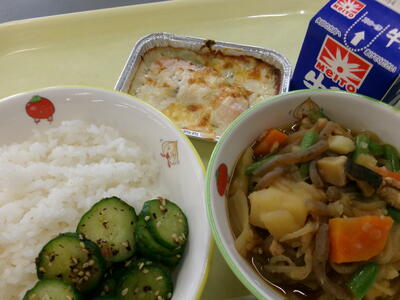 ご飯 鮭のマヨネーズ焼き 肉じゃが 胡瓜のゆかり漬け 牛乳