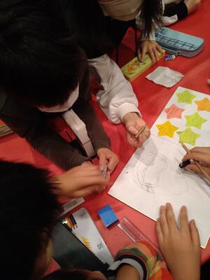 感謝の気持ちを込めて作成しているコーチへの色紙、どのグループも楽しそうに取り組んでいます。