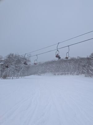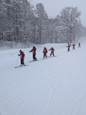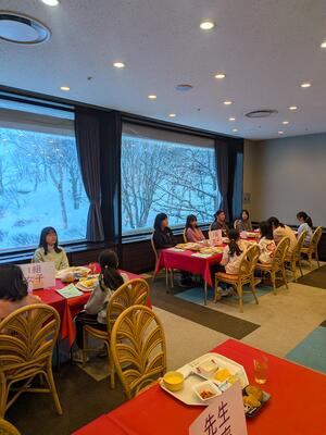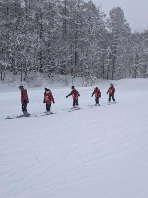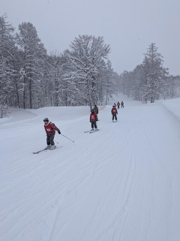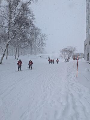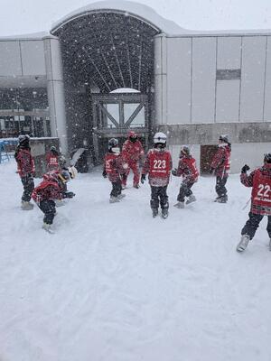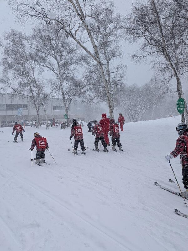 午前のスクールが無事に終わりました。子供たち全員リフトに乗り、戻ってくることができました。現在、グループごとにインストラクターさんと一緒にお昼を食べています。