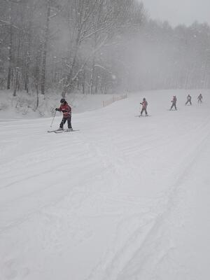子供たちは滑り慣れてきたのか、転ぶ子が減りインストラクターさんについてスイスイ滑る様子が増えてきました。