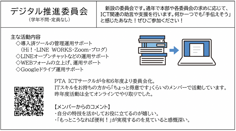 PTA活動に今や欠かせないSNSやICTツールの管理運営・活用をサポートする『デジタル推進委員会』も発足します。
