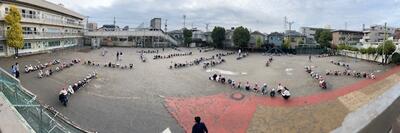 雨上がりの校庭に勢ぞろいの宮田っ子!