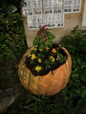 ↑こちらはホラー画像ではありません...ハロウィンを前に「お〇けカボチャ」の一つが爆発(中身が漏れてきちゃう現象)してしまい、岡本さんと地域の方と執行先生で中身をくりぬいているところです!感謝!!