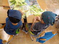 三角巾にエプロンがよく似合う...2年生が今日の給食のとうもろこしの皮むきに挑戦!