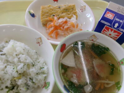初日の給食は行事食 1年を元気に過ごしましょう♪ 投稿日時 : 01/08 宮田小学校管理者 フリーズドライの七草と生の野菜(ボイル済)、出汁、調味料で七草ご飯を作りました。 ご飯とおかずとの相性も◎ よくかんでいただきましょう。