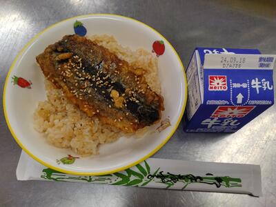 ご飯 秋刀魚の蒲焼き(丼になっています) 牛乳