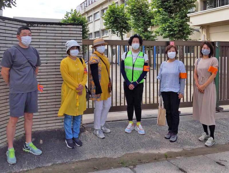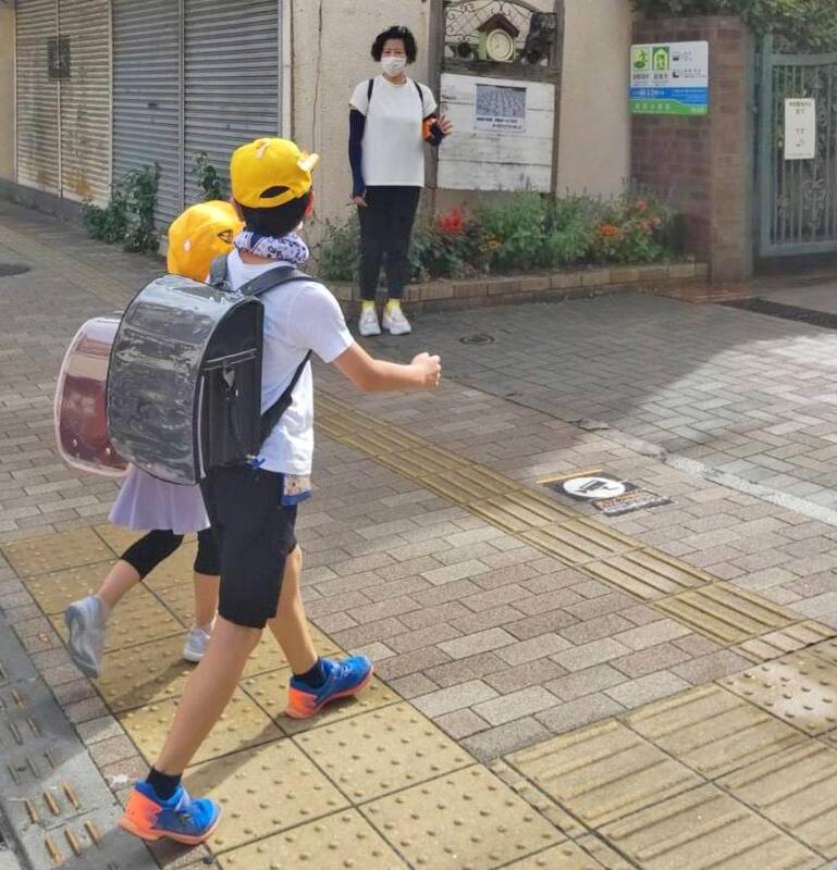 ↑校門で子どもたちに挨拶をする少年補導員の美濃さん