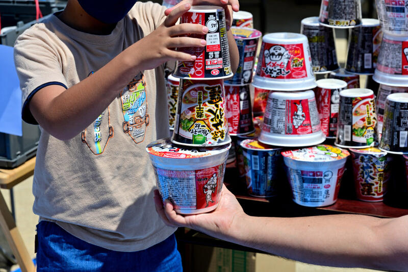 ↑大人気のカップ麺積み。ゲーム時間は8秒間!焦らず欲張らないのがコツだそうですよ。親子でしっかり作戦会議をしてから挑みましょう。
